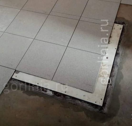 Продуманная схема скрытой установки посадочной части коробки 1200х700 в подготовленное посадочное отверстие в нулевую отметку пола. Облицовка примыкающего по периметру стального обрамления и ГВЛ полотна керамогранитом, плиткой (настил ламината) с эффектом невидимки.